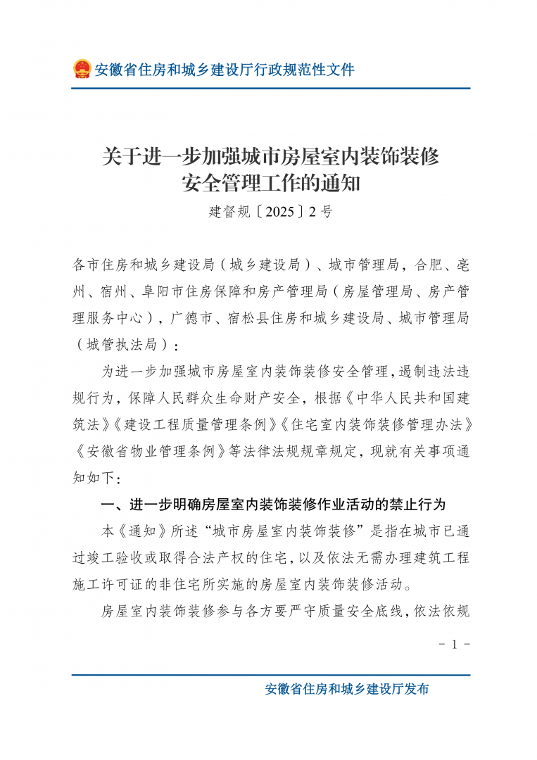 建督规〔2025〕2 号关于进一步加强城市房屋室内装饰装修安全管理工作的通知